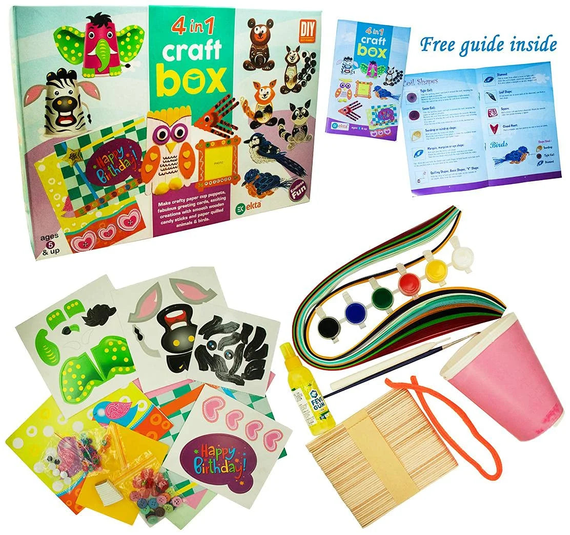 Unleash creativity with our 4-in-1 DIY Craft Box! Includes paints, stickers, paper crafts & guide. Perfect arts & crafts kit for kids ages 5 & up.