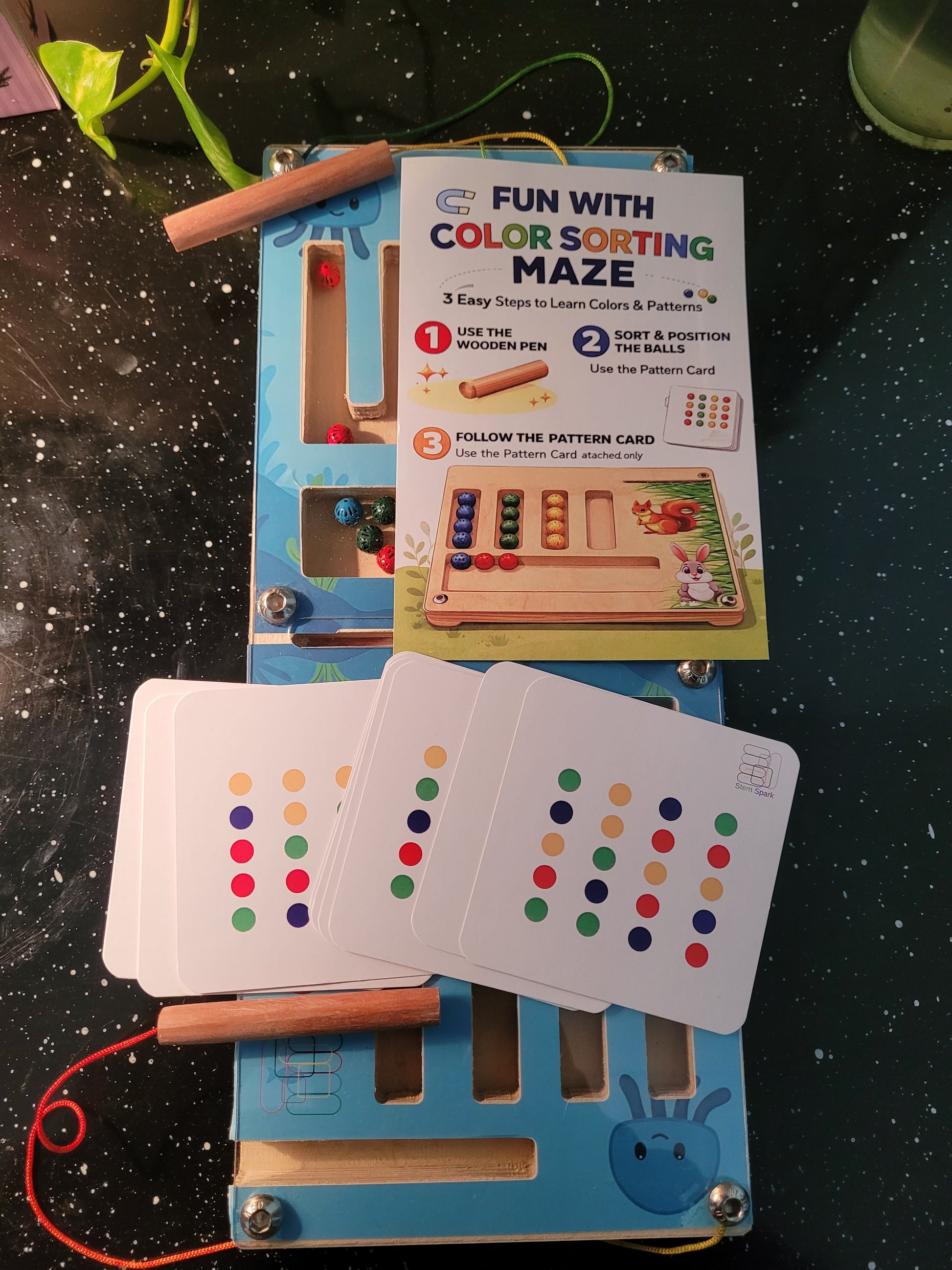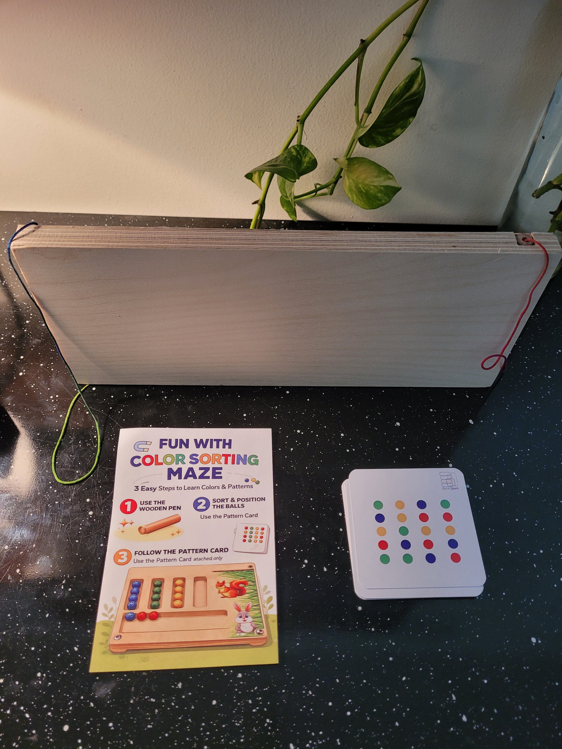 This interactive board comes with pattern cards that show different color sequences. Kids simply observe the pattern and move the colored iron beads through the maze to match the sequence shown on the card. The beads move smoothly using a magnetic wooden pen, making the activity fun, engaging, and mess-free.