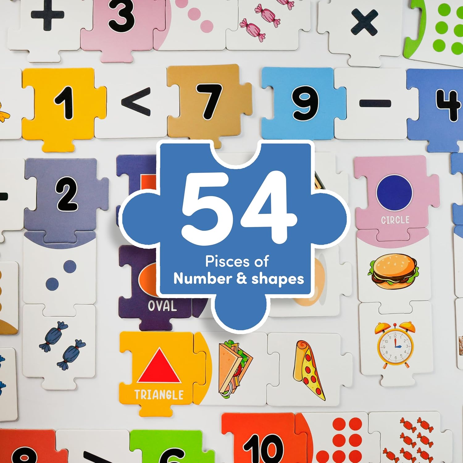 54 Colorful Pieces: Includes matching sets for numbers, shapes, and quantities with fun illustrations like fruits, clocks, and candies.