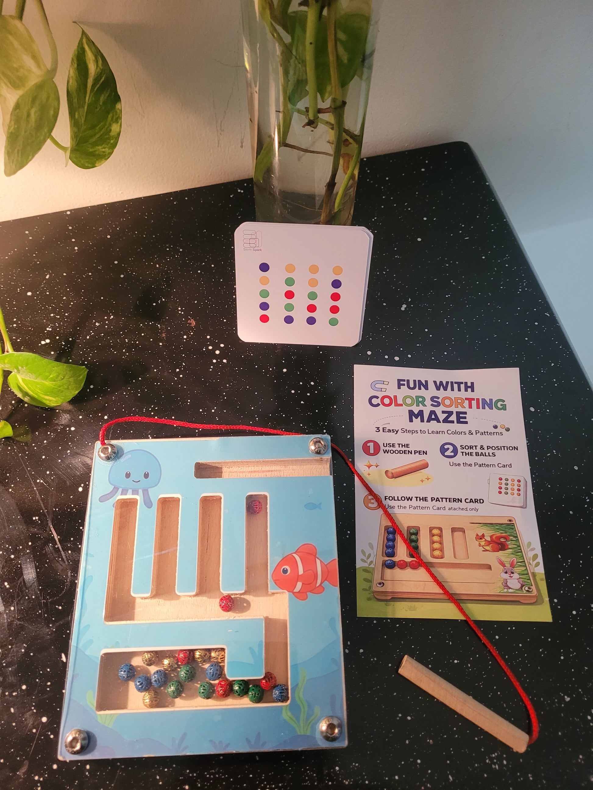 This maze board toy helps children in developing hand eye coordination. Pattern reading, color sequencing, and boosting fine motor skills. Grip control for writing and teaching patience & persistence through trial-and-error.